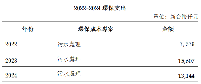 2024年污水处理成本支出为新台币13,144仟元(包含昆山、广东、天津三厂),包括药剂、能耗、人工、固废处置、在线监控等各项投入。